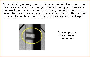 This means that there MUST BE A MINIMUM OF 1.6mm of tread all the way round the tyre.